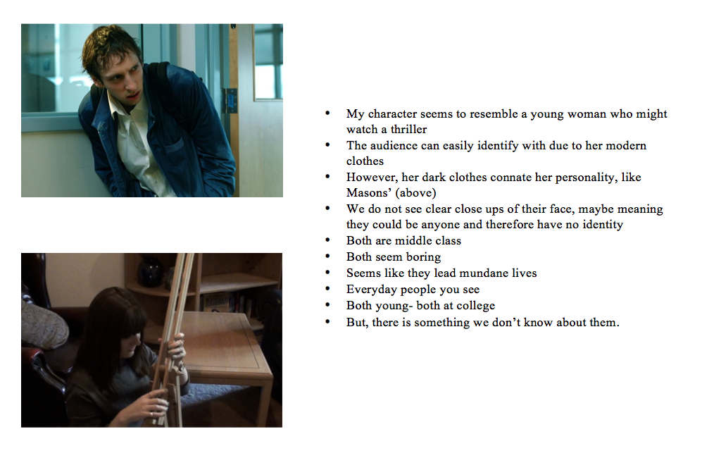 I created a basic questionnaire consisting of  these five questions to ten 16-19 year olds- my target audience. Thrillers do not consist of people which like certain types of music etc. compared to people who like Chick Flicks. They tend to prefer more mainstream, pop music and maybe dislike thrillers/horrors. This played to my advantage because I could then see how a wider audience, coming from many different 'clicks' would perceive my film.